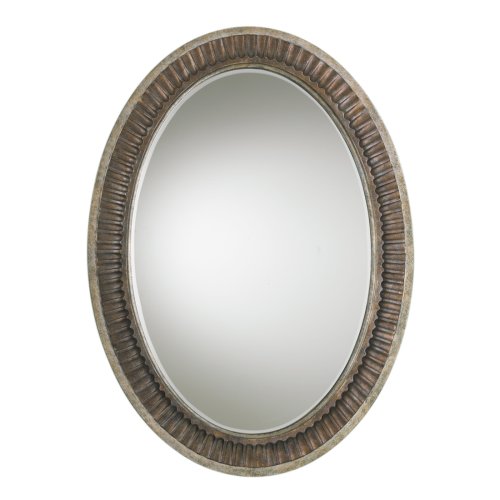 This traditional look mirror has an appealing profile and oval shape. The design comes with an oval frame in a bronze finish with gilded silver highlights. Inspired by the English Regency design period. Beveled mirror. 36" high. 26" wide. Read more...